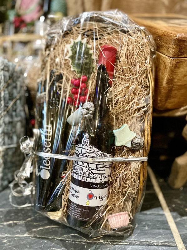 Cesta Regalo “Lo mejor de la tierra” que incluye botella de 500 ml de aove Oleosetin “Legado” Selección ecológico y una segunda botella de 500 ml de nuestro vino de pitarra elaborado en Robledillo de Gata. Además un Jabón Artesano elaborado como se hacía antiguamente con aceite de oliva virgen extra, “Los jabones de Lumi”.
